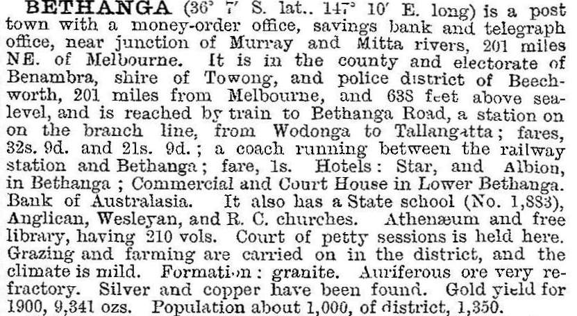 In 1903 Bethanga was described in the Australian handbook: