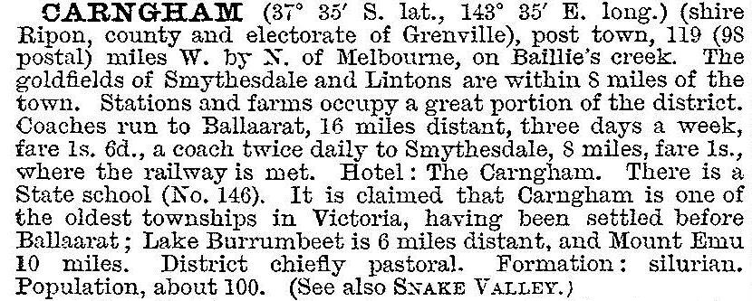 Carngham, once a gold mining township, is a pastoral locality 25 km west of Ballarat. Its gold field was at the edge of a mining district which ran south-easterly to Snake Valley.