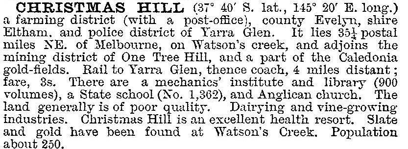 Unlike neighbouring areas Christmas Hills did not have goldmining or significant amounts of agricultural land, although the One Tree Hill on its western side was a mining site. Nevertheless it helped numerous settlers who earned income from firewood as their selections were cleared. In 1884 a primary school was built, and three years later the district's population was boosted by a temporary workforce employed on building an aqueduct from the Watts River weir to Preston reservoir. In 1903 the Australian handbook described Christmas Hills as: