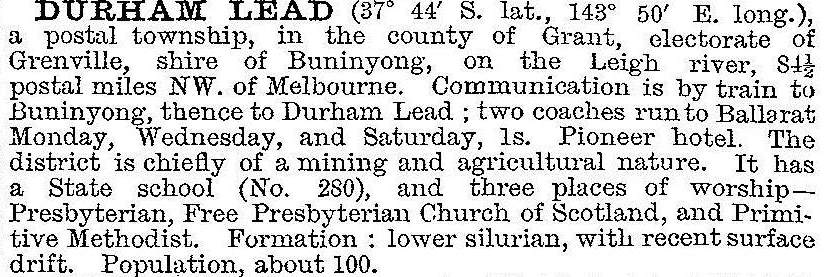 Durham Lead (also known as Durham, 1870s) was a mining township 15 km south of Ballarat. It was one of several mining centres along the main mining lead running south of Ballarat, generally along the valley formed by the Yarowee or Leigh River.