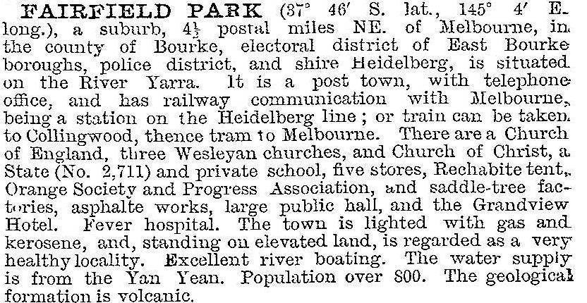 Apart from the riverside meanders which have mudstone adjoining them on the Fairfield side, all of Fairfield is on basaltic land. Consequently it did not have brick-claypits like neighbouring Northcote, and only one quarry at its northern edge. Fairfield thus developed as a mixture of comfortable residences – usually timber – and light industrial uses. The flood-prone Fairfield Flat was drained in 1907-08. Station Street became the main shopping strip and by the mid-1920s had a mature range of shops and the Park picture theatre. The Fairfield North Primary school (actually in Thornbury south), opened in 1928.