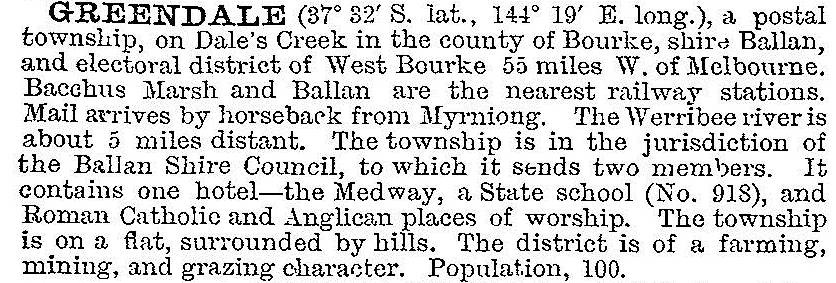 Greendale is a rural/residential area 65 km north-west of Melbourne, northwards of the Western Freeway between Bacchus Marsh and Ballan. It is believed that the name is descriptive of the area, and Dale Creek flows through the village.
