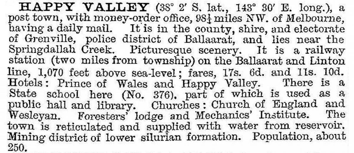 Happy Valley was one of the few gold towns in the area that experienced continual mining until the 1900s. Its school – at first named Lucky Woman’s after a successful mine – was opened in 1860. Bailliere’s Victorian gazetteer (1865) also recorded a post office, a police station, a branch bank and several hotels in Happy Valley. The town’s social institutions changed during the next 20 years with hotels numbering two and churches three.