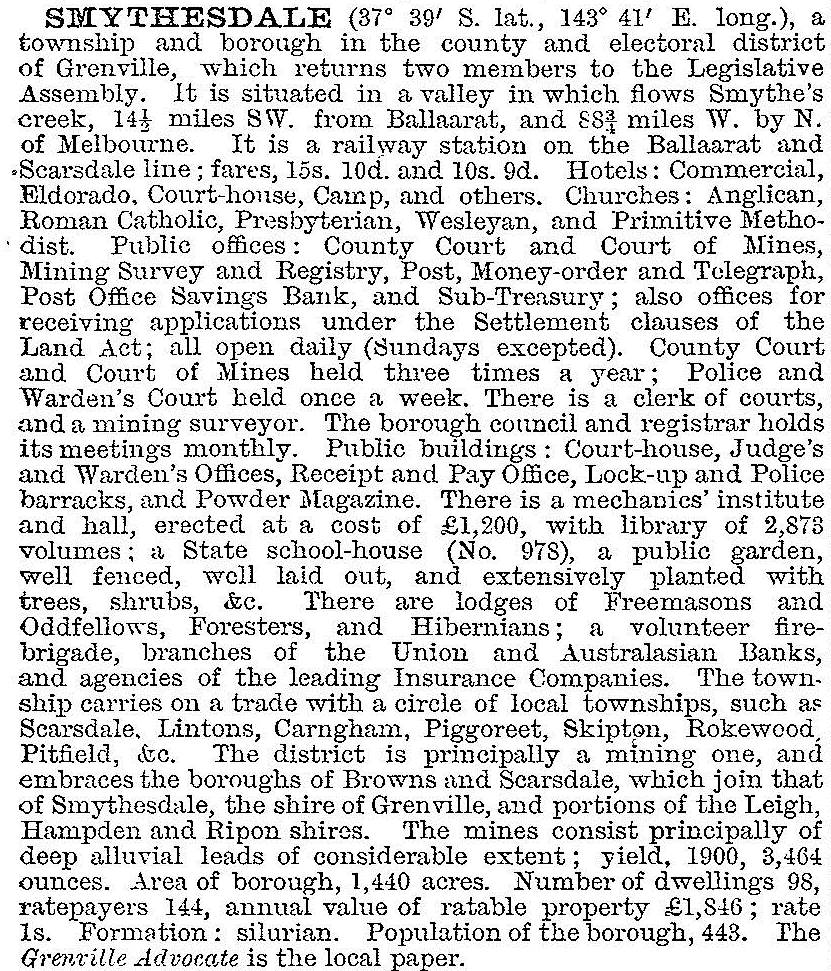 Smythesdale was described at some length in 1903 in the Australian handbook, a time when its population was about one quarter of the figure during the 1860s: